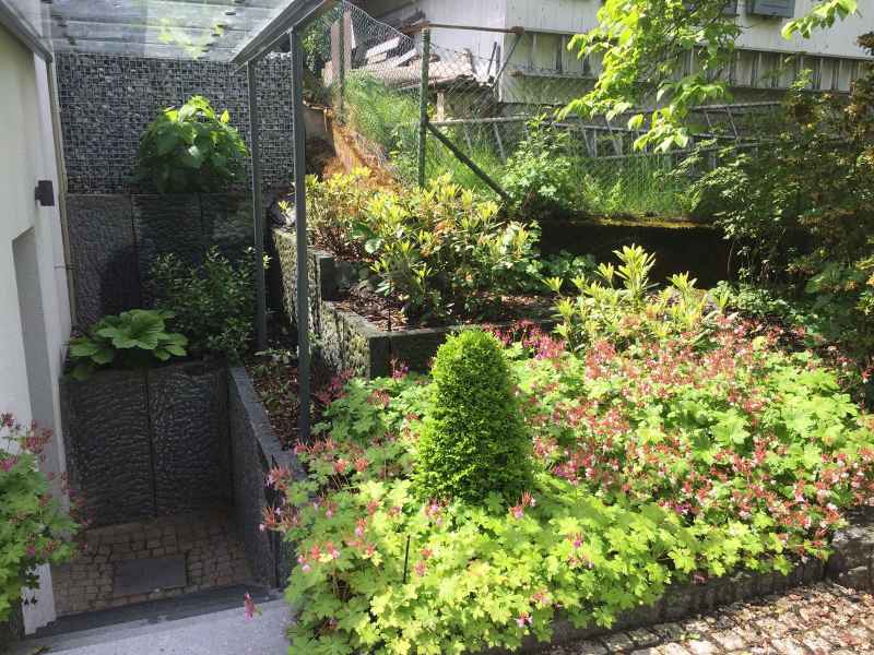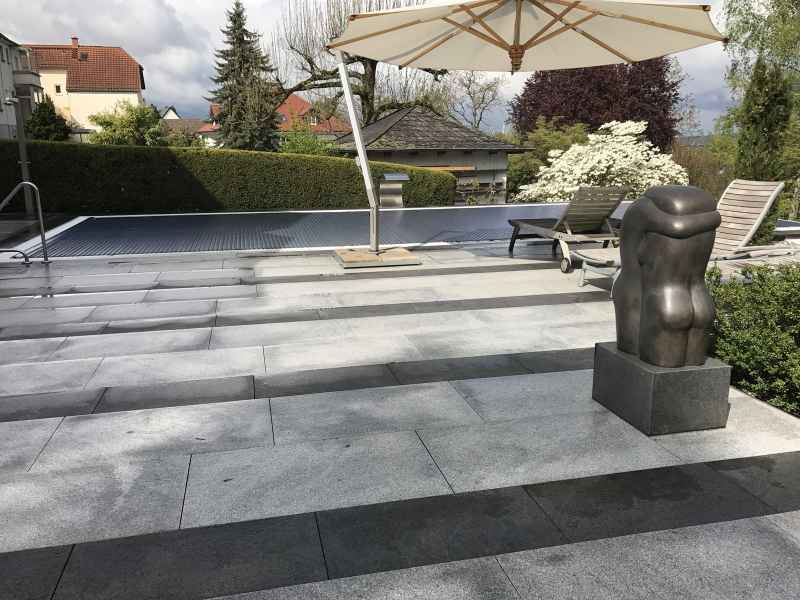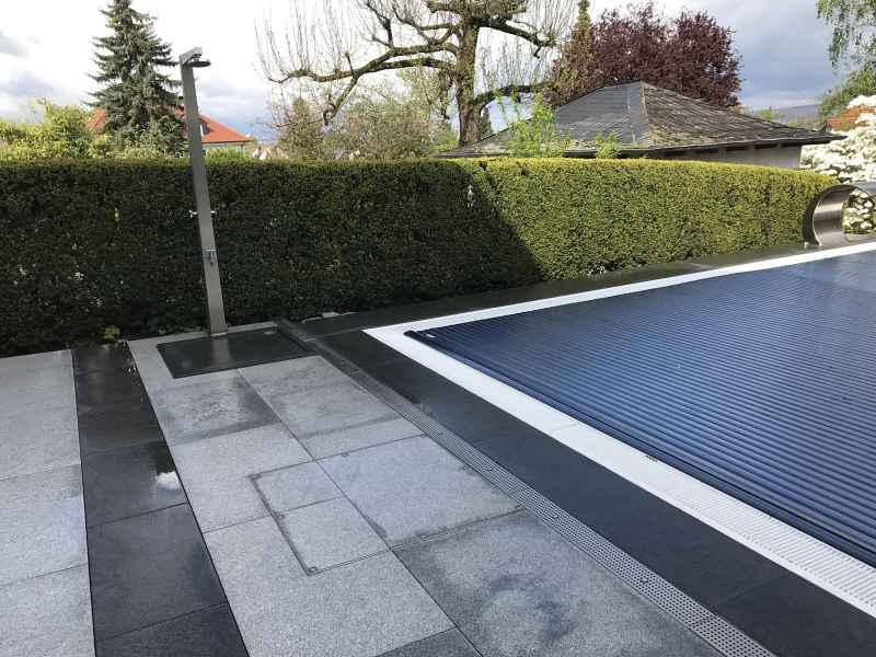Umgestaltung einer Rasen- und Pflanzfläche, entstanden ist eine Wohlfühloase mit Terrassen, Dusche und Pool